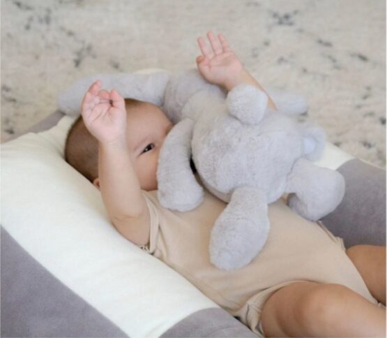 Его можно прикрепить к кроватке или коляске с помощью зажимов на лапах.