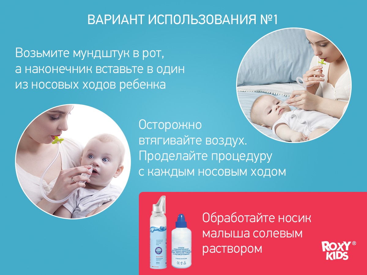 Aspiratorul pentru bebeluși ROXY-KIDS cu adaptor pentru aspirator inclus poate fi folosit în două modalități: ca aspirator mecanic obișnuit alimentat de respirația mamei sau ca aspirator.