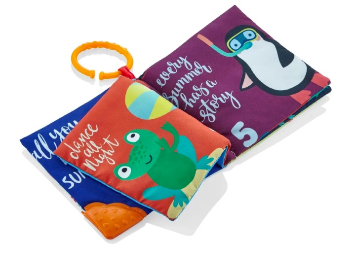 – cartea este prevazuta cu 3 pagini care fosnesc si viu colorate cu diferite personaje si animale. In coltul primei pagini se afla o jucarie de dentitie ce ajuta copilul la calmarea gingiilor.