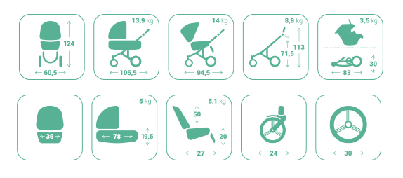 Конструкция универсальной коляски дает возможность устанавливать на ней люльку, сиденье прогулочного блока или автомобильное кресло. Спальный вариант коляски предназначен для детей от 1 до 6 месяцев жизни (максимальный вес ребенка 9 кг), прогулочный блок рассчитан на возраст от 1 месяца до 3 лет (максимальный вес малыша 15 кг).