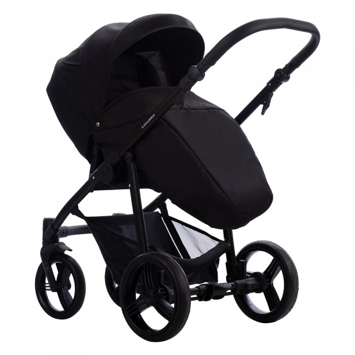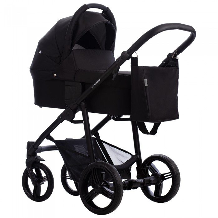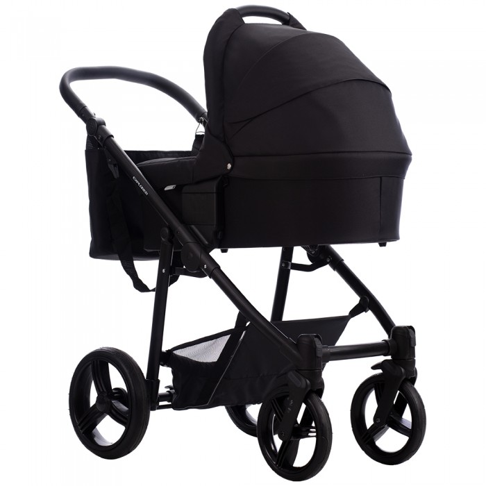 Отличительными особенностями данной модели являются прямоугольная форма люльки, полностью обтянутая однотонной тканью, и изысканный дизайн конструкции в черном цвете.