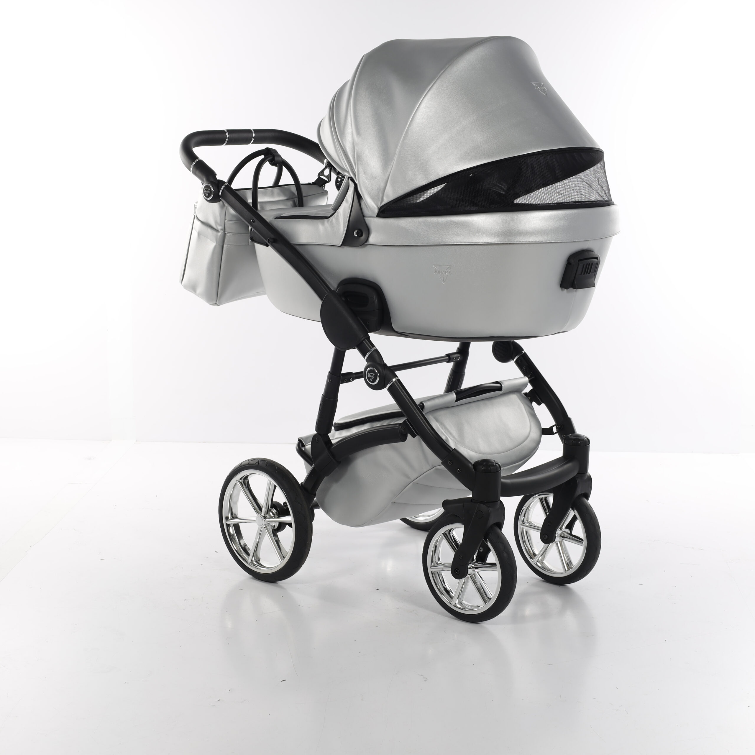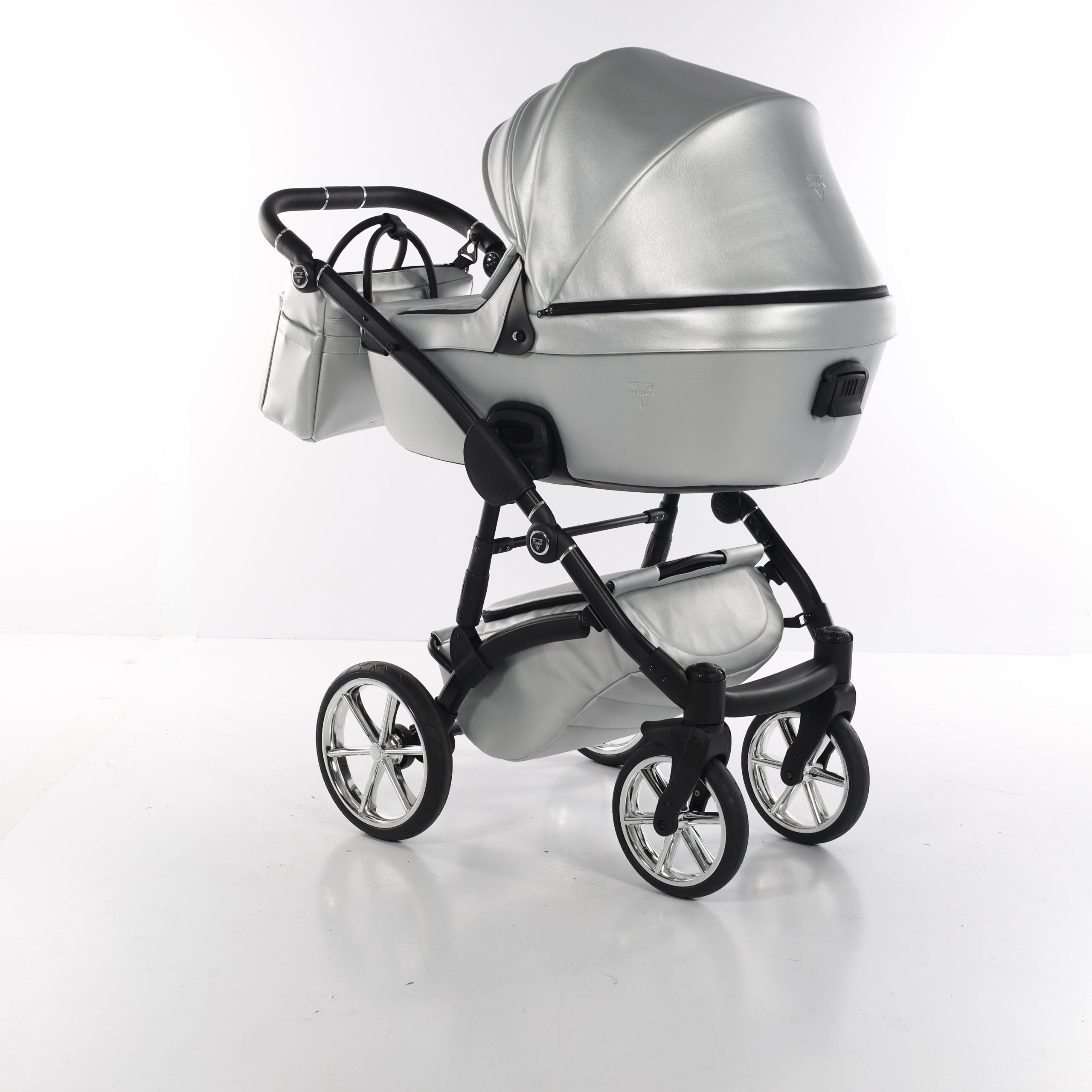 Acest efect este creat de designul unic al leagănului sub un diamant: fundul lucios este realizat din plastic lucios cu margini voluminoase. Partea superioară a căruciorului este realizată din material de înaltă calitate, care adaugă grație și eleganță.