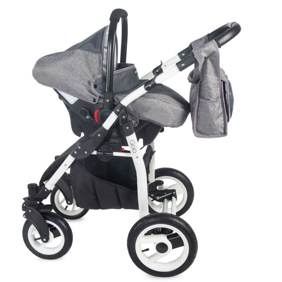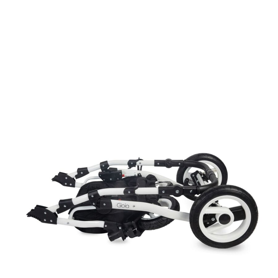 Caruciorul GIOIA este destinat copiilor cu varsta cuprinsa intre 0-36 luni cu o greutate de pana la 15 kg si o inaltime maxima de 110 cm. Cadrul GIOIA are in dotare roti din cauciuc gonflabil, iar cele de pe fata sunt pivotante. Cadrul dispune de un sistem de suspensii foarte elastic, iar frana este de tip sistem „cablu”, fiind montata pe rotile din spate. Un accesoriu util este si geanta incapatoare, prevazuta cu accesorii de prindere pe cadru.