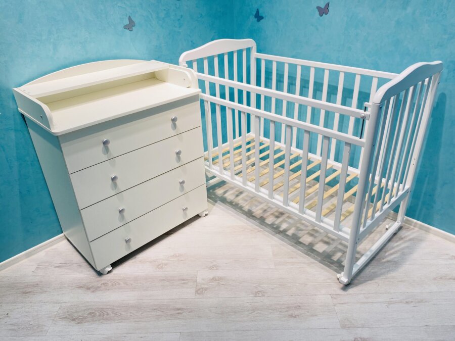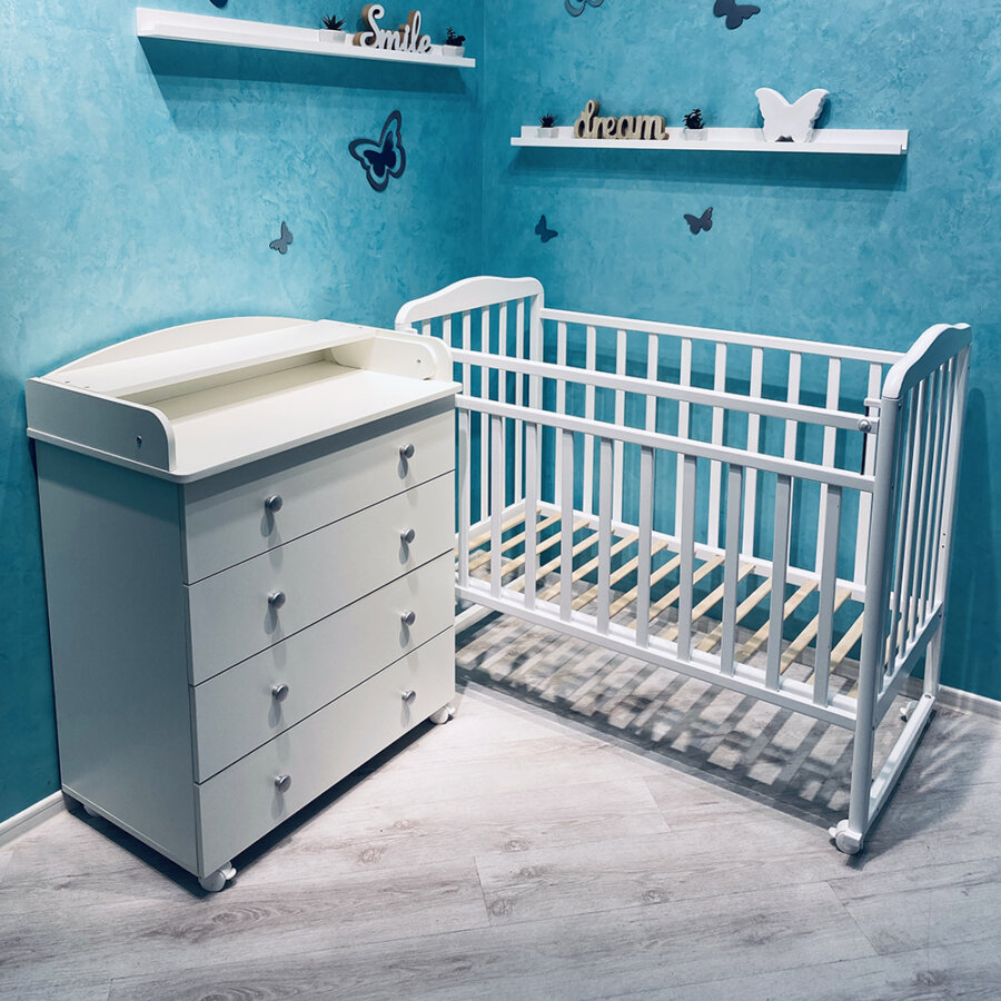 В данную коллекцию входит кроватка из натуральной березы и комод с четырьмя вместительными ящиками для хранения детских вещей, превращающий ее в полноценный стол.