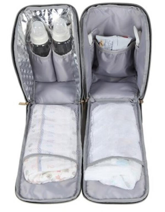 Передний клапан с надежной застежкой на кнопку. Одно внутреннее открывающееся отделение на молнии для важных предметов и один большой открытый карман для легкого доступа. Один внутренний прозрачный карман для мобильного телефона. Внутренний сетчатый карман для пеленального коврика. Два боковых кармана для хранения бутылок и влажных салфеток Большой изолированный карман для бутылочки. Один большой карман на спине сумки. В комплекте мягкий моющийся пеленальный коврик. Ремешки для коляски с крючками в комплекте.