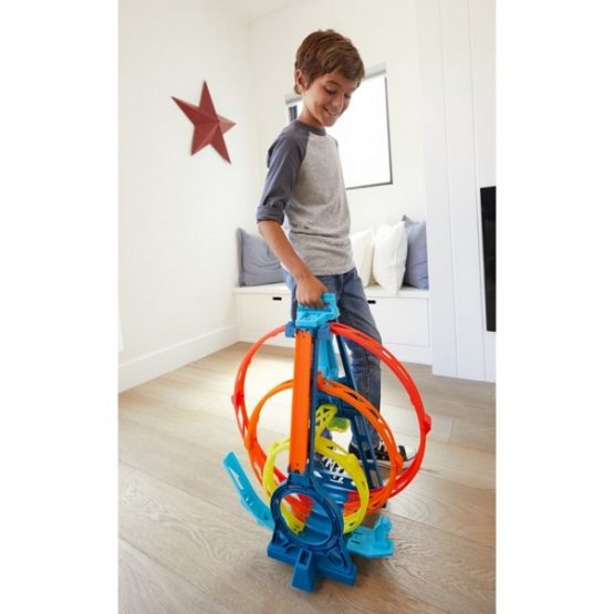 Încercați cea mai mare buclă triplă Hot Wheels din toate timpurile! Alegeți una din cele 3 opțiuni de asamblare a jocului și începeți competiția. Conduceți de-a lungul a trei bucle, glisați în jos din cel mai înalt punct al pistei sau săriți prin bucle. În oricare dintre opțiuni, sarcina principală este de a efectua un truc și de a intra în container cu o mașină. Setul se pliază compact pentru depozitare și transport ușor. 1 mașină de bază inclusă.