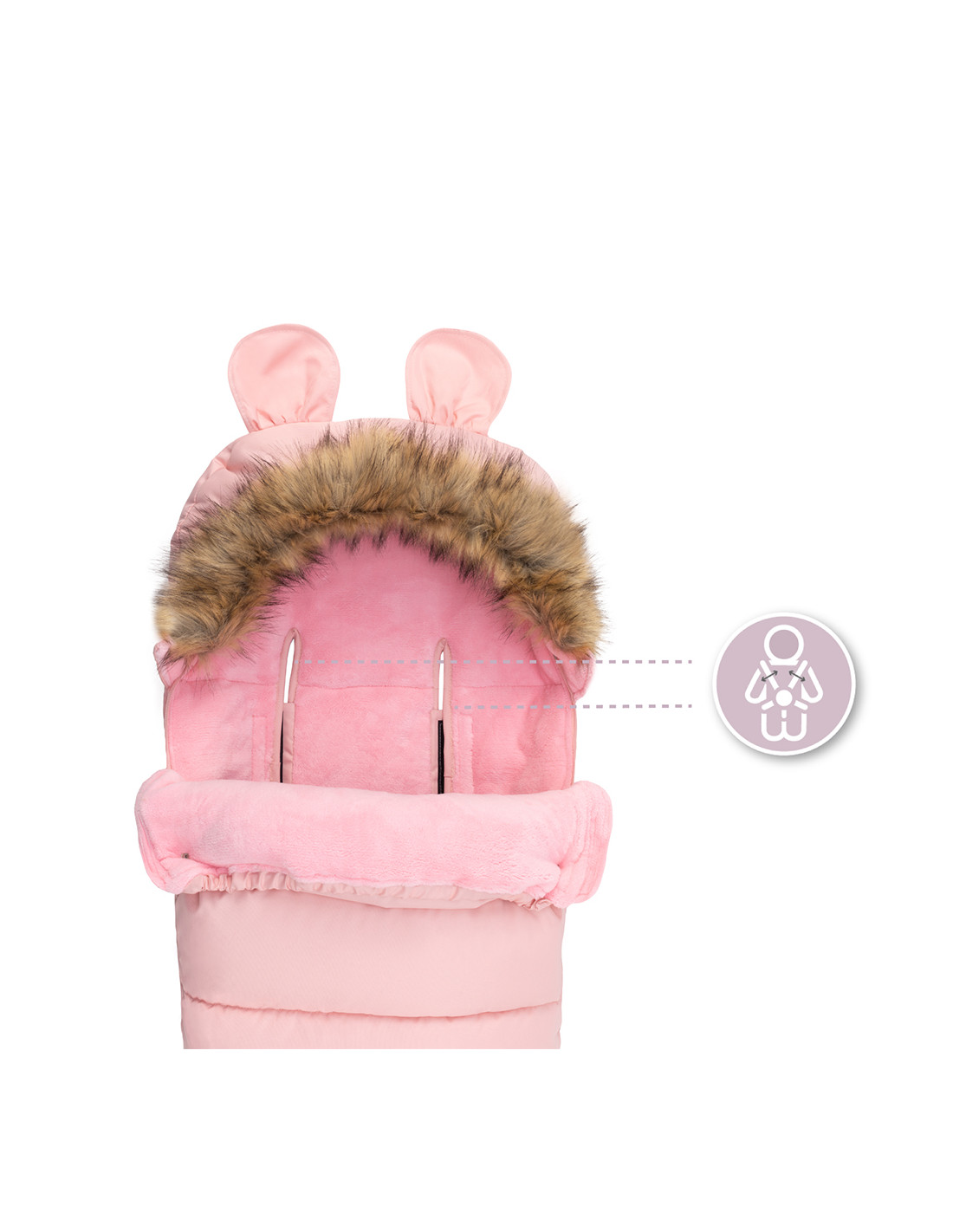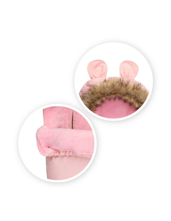 Muff MoMi are o glugă caldă, cu urechi distractive căptușite cu blană artificială detașabilă. Fantele pentru curele sunt potrivite pentru curele cu 3 și 5 puncte