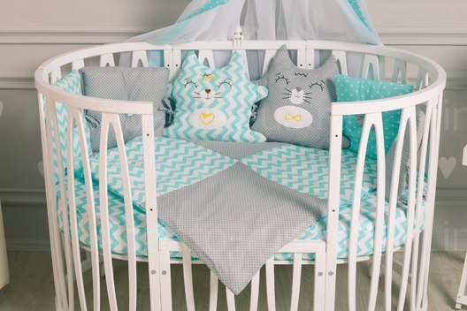 Ткань выбрана в приятных пастельных тонах, служит украшением спального места малыша.