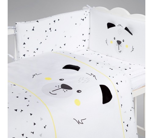Protectia laterala are rolul de a oferi siguranta: in timpul noptii copilul se poate rostogoli existand posibilitatea ca acesta sa se loveasca de gratiile laterale ale patutului. Toate materialele sunt hypoalergenice, testate conform reglementarilor Europene. Se pot curata prin spalare la 40′ celsius, fara clor sau inalbitor, si se pot calca la o temperatura medie. Perna, Plapuma si protectia laterala contin in interior vatelina tip poliester de foarte buna calitate ce permit aerisirea.