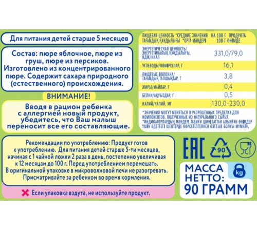Ambalaj convenabil, modern – păianjen, păstrează pe deplin proprietățile utile ale fructelor, ocupă puțin spațiu, este convenabil in calatorii și la plimbari! Piure este fabricat la cea mai recentă instalație modernă, în conformitate cu cerințele de înaltă calitate pentru hrana pentru copii.