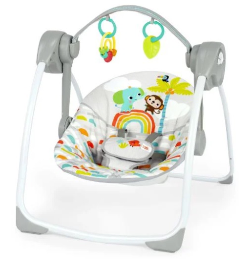 Oferiți-i bebelușului o stare de spirit de vacanță cu leagănul portabil Bright Starts Playful Paradise. Asemeni palmierilor care se leagănă în bătaia vântului, bebelușul se va legăna liniștit în acest scaun confortabil sau se va juca pe îndelete cu jucării interactive. Cele 2 jucării inspirate din natură, designul vesel al curcubeului și prietenii elefant și maimuță îl vor distra pe cel mic.