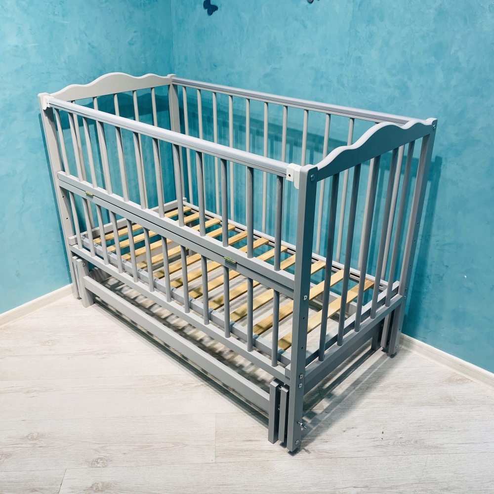 Pătuț pentru copii din lemn natural. Lamele de fag garantează poziția corectă a coloanei vertebrale a copilului.