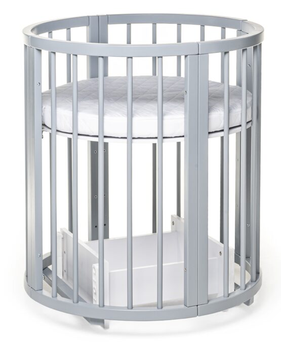 Pătuțul transformer rotund/oval Olivia a fost creat special pentru a aduce mama și copilul mai aproape – acum mama se poate apropia de bebeluș din orice parte a pătuțului.