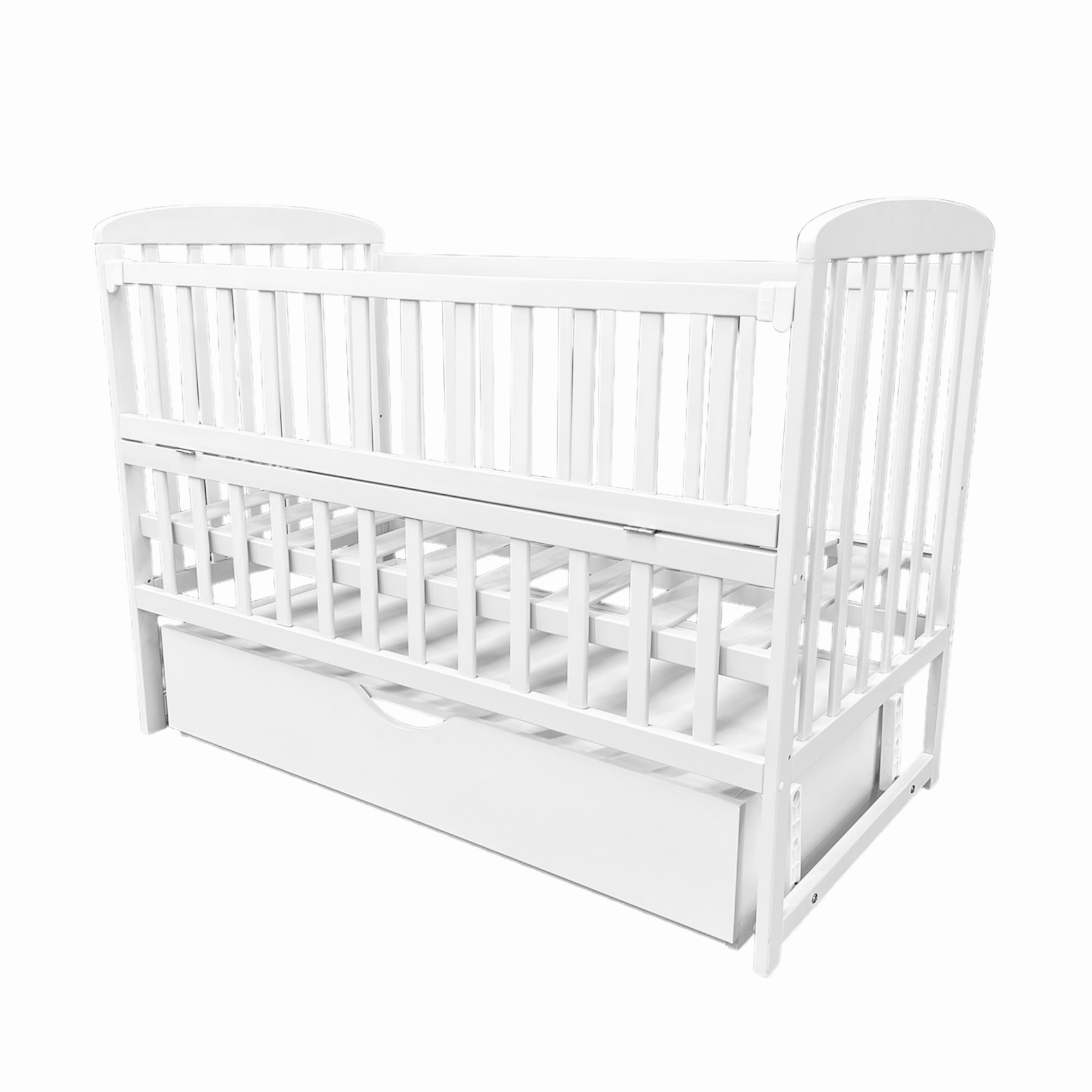 Patul are un perete lateral rabatabil, un mecanism de pendul silențios pe rulmenți;