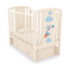 Pătuțul folosește un design decorativ inovator cu materiale textile. Este confecționat din MDF și Fag MASSIV- sunt produse de înaltă calitate, non-toxice si inovensive pentru sănătatea bebelușului și a mamei. Mecanismul brevetat pentru coborârea laturii din partea frontală poate fi îndepărtată în întregime.