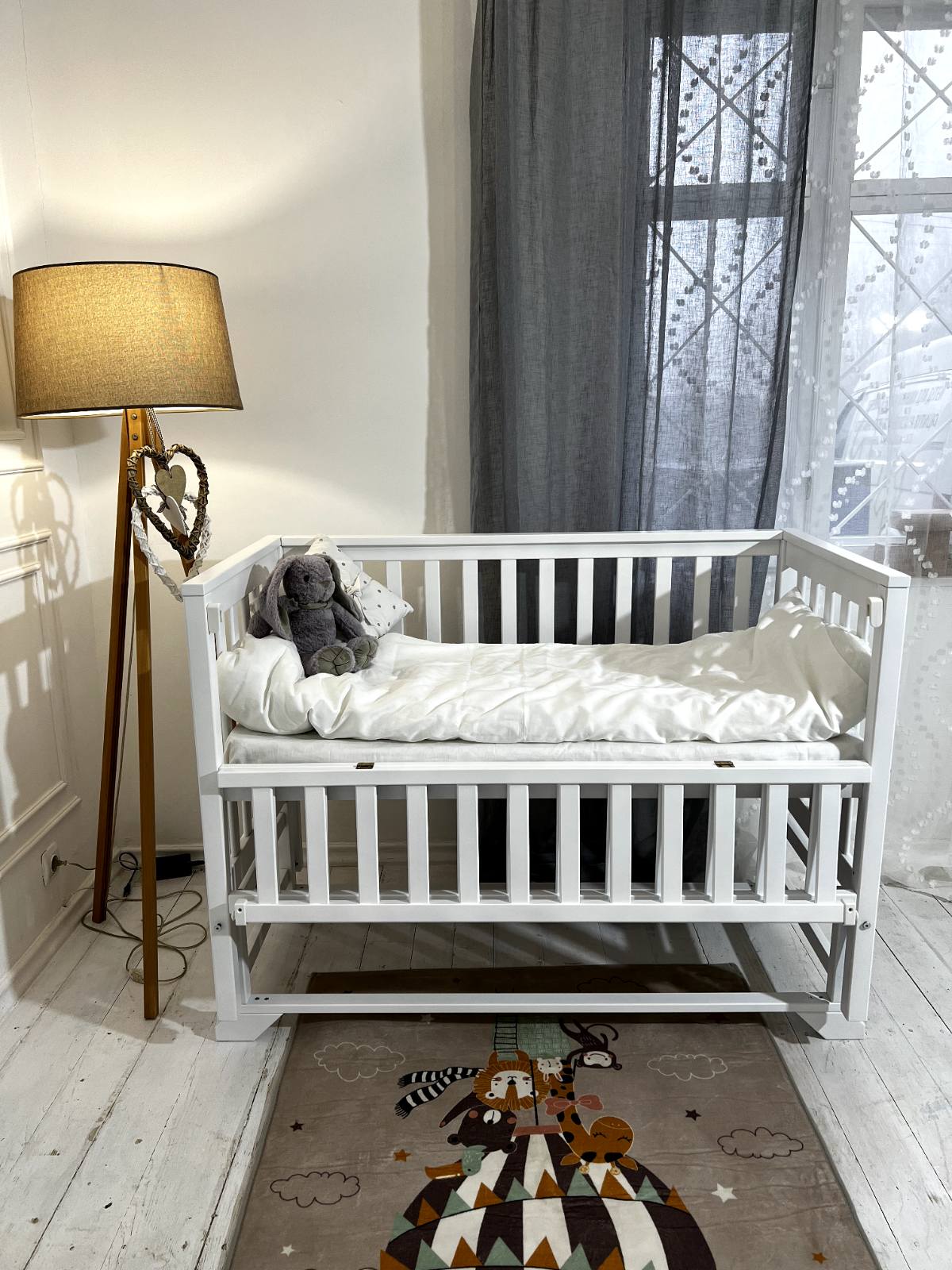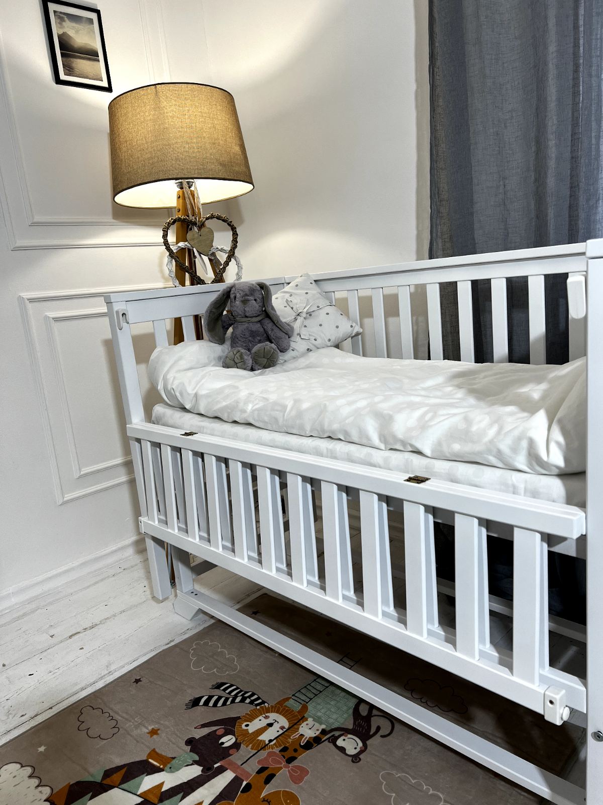 Деревянная кроватка изготовлена полностью из древесины карпатского дерева бук. Все детали тщательно отшлифованы и покрыты экологически льняным маслом и краской на водяной основе, которая не вызывает аллергической реакции у детей. Планки расположены между собой на таком расстоянии, что ручка или ножка малыша не застревает между ними.