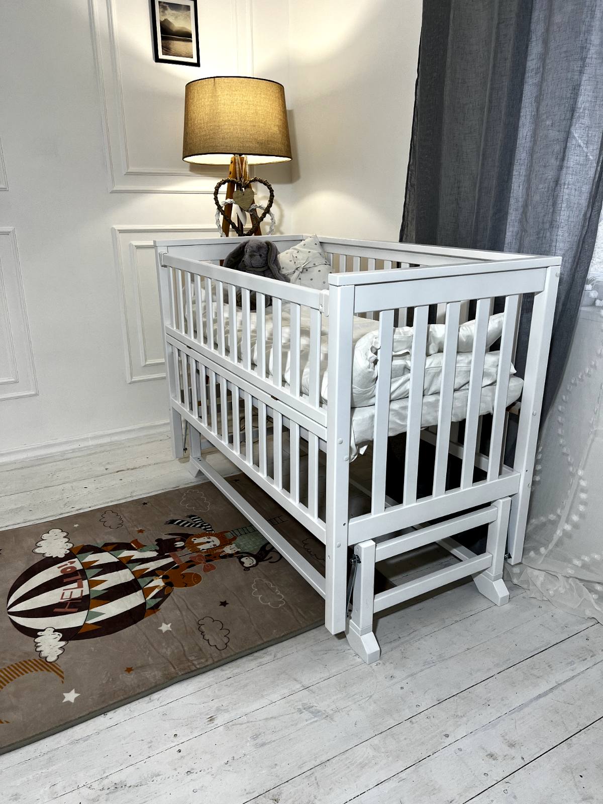 Кроватка имеет откидную боковину, бесшумный продольный маятниковый механизм на подшипниках с фиксатором;