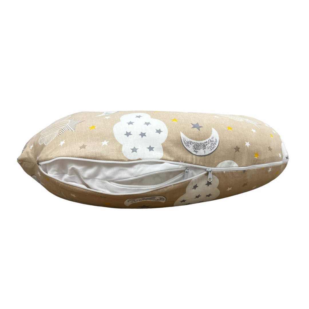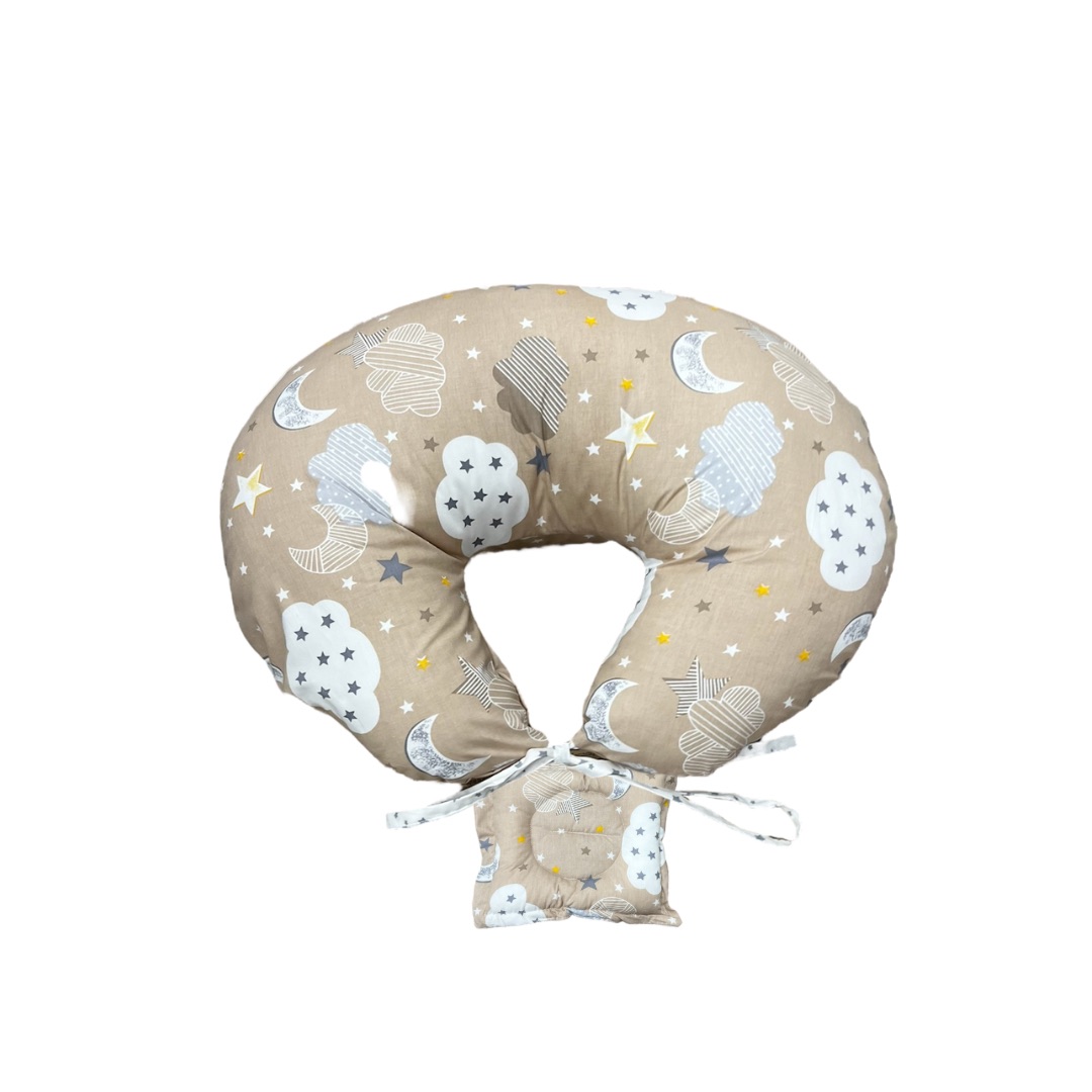 - Forma ergonomică a pernei contribuie la poziționarea corectă a copilului, prevenind tensiunea la nivelul gâtului și spatelui mamei.