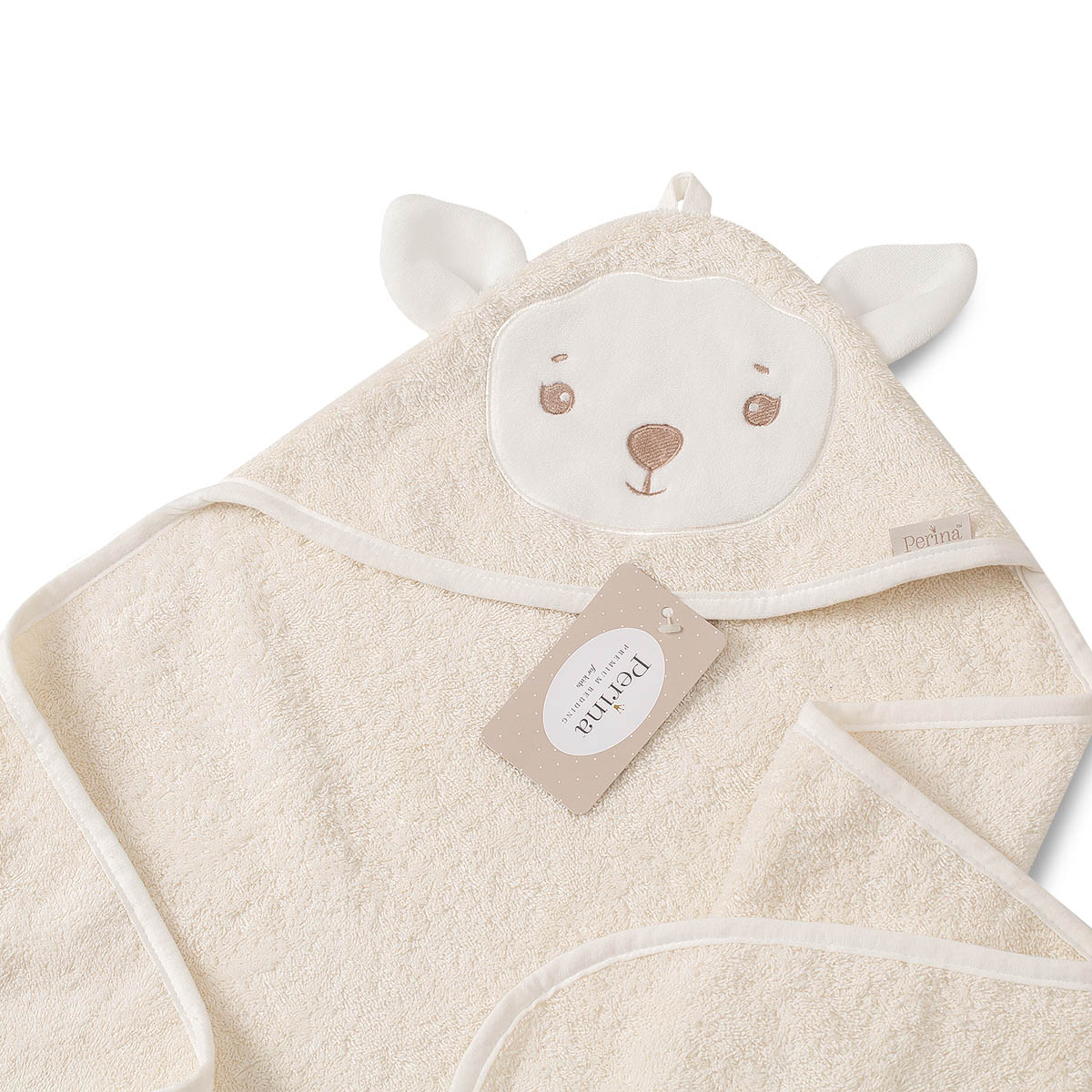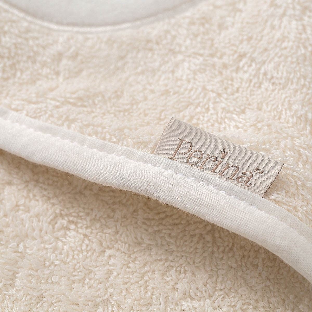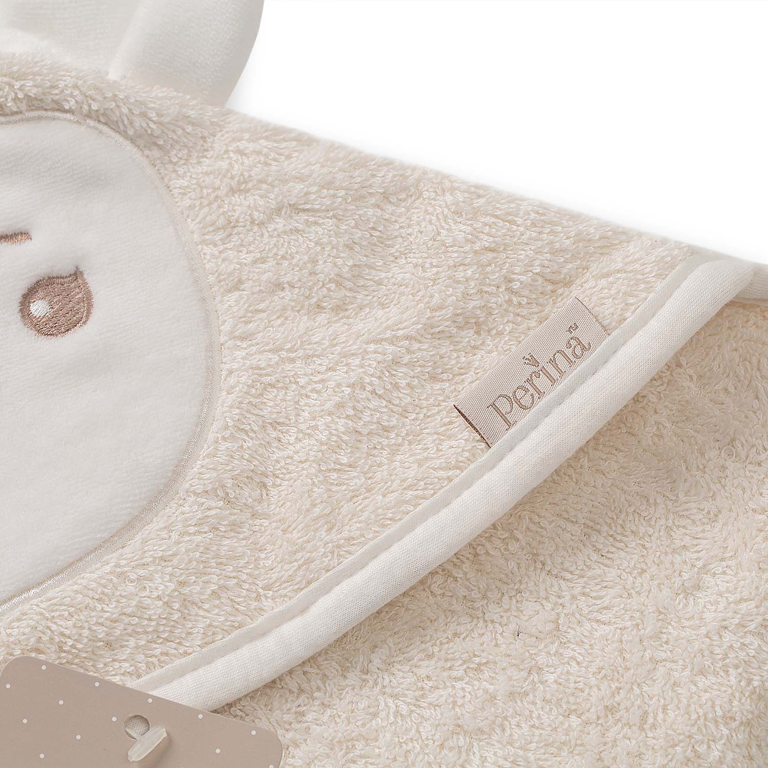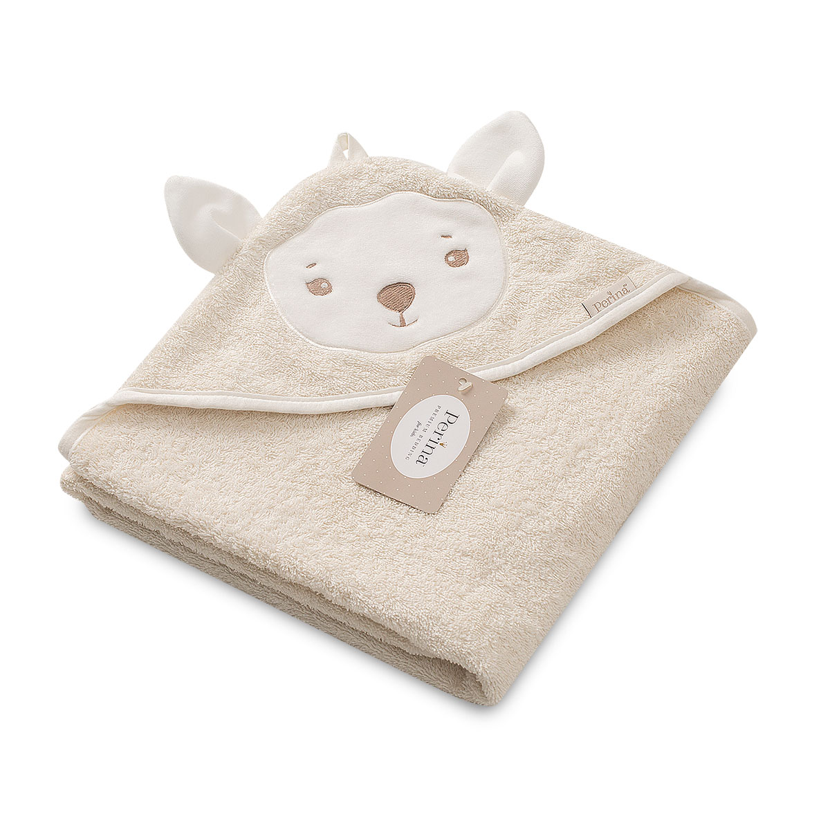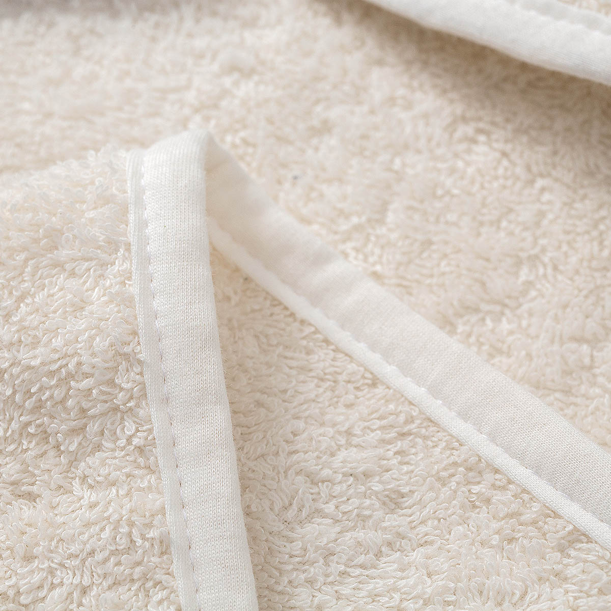 Полотенце из махровой ткани — 100% хлопок. Плотность 420 грамм / м.кв. Его размеры позволяют полностью укрыть малыша, а махровая ткань прекрасно впитывает воду. После стирки хлопок остается пушистым и приятным на ощупь.