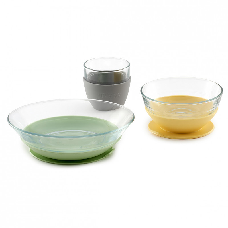Набор состоит из тарелки, миски и стакана из безопасного стекла с гибкими антипригарными основаниями. Разработанные для предотвращения несчастных случаев, гибкие основания тарелки и миски имеют присоски, чтобы прикрепляться к столу или подносу обеденного стула.