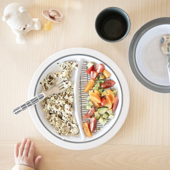• Set compus din: farfurie cu 2 compartimente, bol, pahar si doua tacamuri.