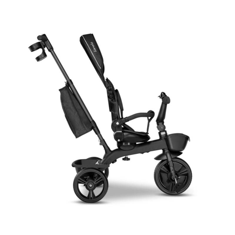 Ca un cărucior cu triciclu Kori permite părintelui să rotească scaunul – un mic explorator poate privi traseul de mers pe jos sau se poate orienta către părinte. Roata liberă și ghidonul îl fac pe cel mic să joace „direcționând” bicicleta, în timp ce părintele controlează vehiculul cu un mâner reglabil.