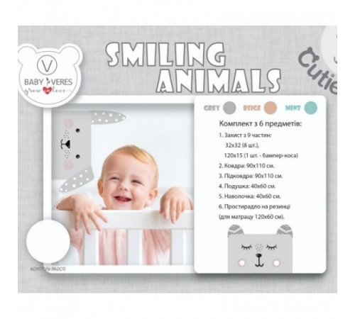 Lenjeria de pat Veres Smiling animals este confectionata din bumbac natural cu o buna permeabilitate la aer, sigura pentru pielea sensibila a copiilor, deoarece nu provoaca reactii alergice la utilizare, are rezistenta mare la uzura si durabilitate, si isi pastreaza aspectul si rezistenta cusaturilor la spalare frecventa. Husa de pilota cu fermoar este comoda si practica de utilizat. Umplutura pentru bara de protectie – holofiber – este hipoalergenică, își păstrează bine forma, iar pernele și păturile – fibră moale – moi și plăcute la atingere, asigură „proprietăți de respirație”, termoreglare. Patura este matlasata, ceea ce asigura siguranta formei produsului dupa spalare. Toate materialele de așternut sunt certificate și respectă cele mai înalte standarde de mediu.