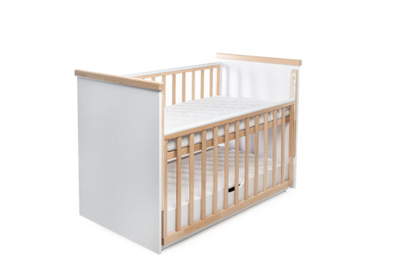 Patul este realizat din pin masiv, este ecologic, durabil și sigur pentru bebeluș. Este finisat cu lac netoxic și vopsea pe bază de apă recomandată pentru mobilierul pentru copii. Patul are două poziții de reglare pe înălțime. Formele pieselor sunt rotunjite și sigure, echipat cu pendul transversal cu posibilitate de fixare. Patul este completat cu sertar închis, cu două spații, pentru depozitarea lucrurilor (cutia este din PAL certificat de înaltă calitate).