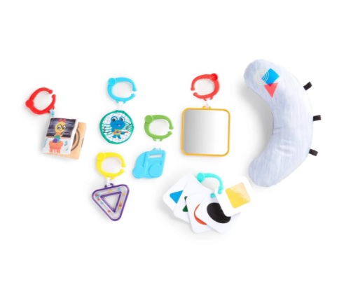 - Включает в себя 7 съемных игрушек, в том числе: пианино Magic Touch, подушку для игр на животике, шуршащую игрушку, текстурированную музыкальную ноту, зеркало для самопознания, треугольную погремушку, несколько маленьких блестящих карточек.