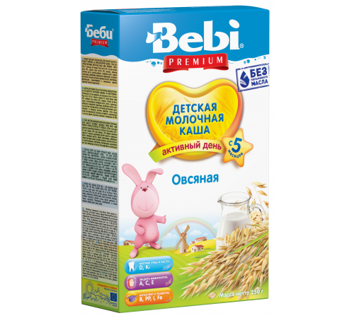 Овсяные каши Bebi Premium содержит 12 важных витаминов (группы В, А, Е, К) и микроэлементы (железо, йод). И все это вместе с пользой специально подготовленного для детского питания молока.