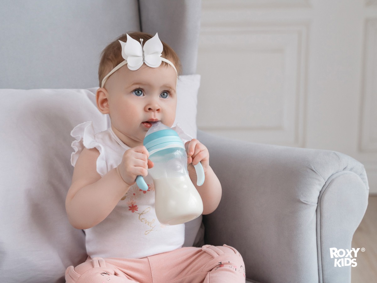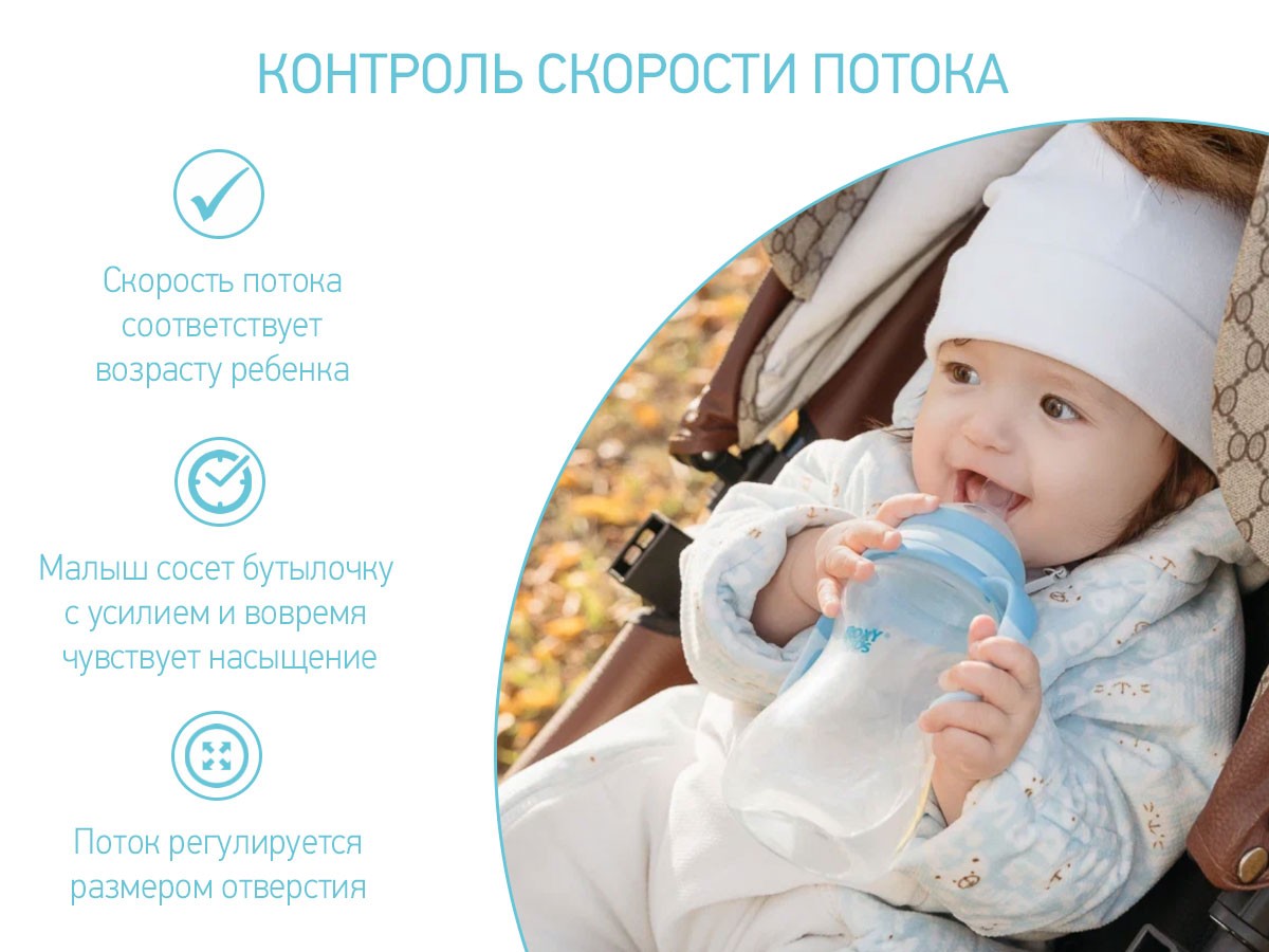Бутылочка для кормления с силиконовой соской подходит детям от 6 месяцев.