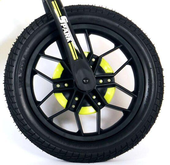 Корпус выполнен из стали с ударопрочным покрытием и износостойким пластиком. Колеса 12 дюймов с резиновой крышкой со специальным наполнителем внутри, который имитирует правильное давление в колесе, при этом не требует подкачки. Диски с оригинальным дизайном, подсветка дисков (без батареек, по методу динамо-машины). Сиденье из ЭКО-кожи. Регулируемый руль по высоте с мягкими ручками. Ограничитель поворота руля для безопасности ребенка Регулируемое по высоте сидение.