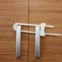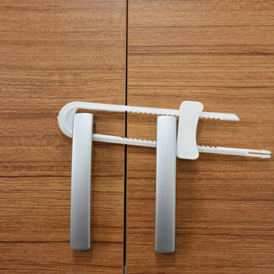 Замок, который соединяет две ручки друг с другом и может быть открыт только взрослым, нажав на пружинную кнопку сбоку, удерживает шкаф закрытым.