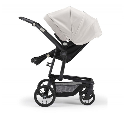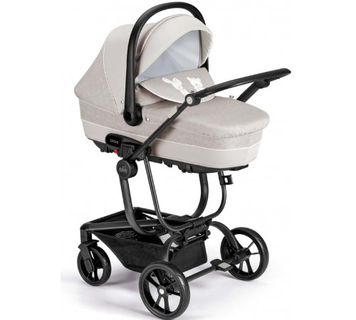 ПРОГУЛОЧНАЯ ЧАСТЬ: алюминиевые шасси с регулируемым двусторонним сидением (лицом против движения для возраста 0-12мес, по ходу движения для возраста 12-36мес)большие, легкосъемные задние колеса, передние поворотные колеса, педаль тормоза, мягкая подвеска, регулируемая в 4 положениях спинка, съемный бампер, 5-точечные ремни безопасности с мягкими накладками, увеличенный капюшон и его козырёк, корзина для покупок. Шасси легко компактно складываются книжкой.