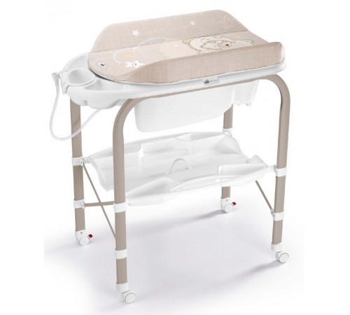 Столик для пеленания с мягким матрасиком с системой предотвращения падения, ванночка имеет два нескользящих сиденья: наклоненное сиденье для малышей 0-6 мес, и второе с подлокотниками — для малышей постарше от 6 до 12, отделение для губки и мыла, заглушка и шланг для слива воды, ящик для аксессуаров, 4 колесика (2 с тормозами), идеально для небольших ванных комнат. Легко и компактно складывается одной рукой.