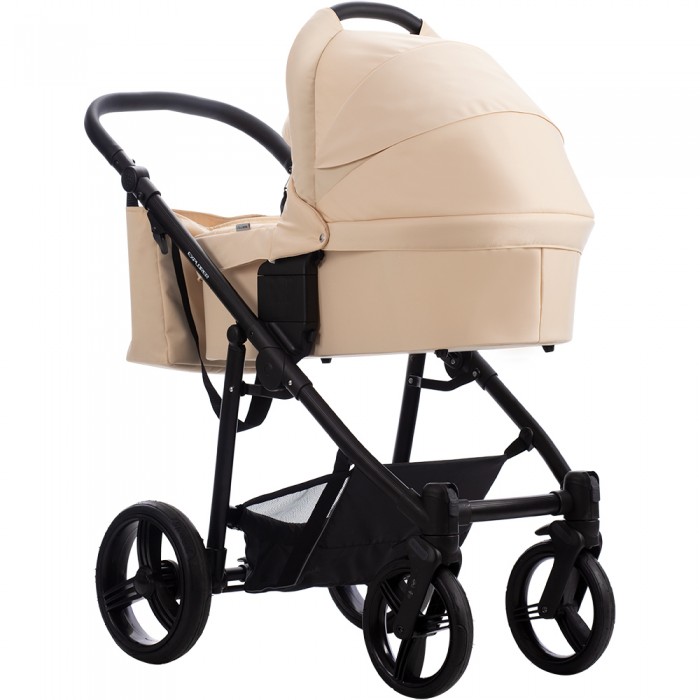 Отличительными особенностями данной модели являются прямоугольная форма люльки, полностью обтянутая однотонной тканью, и изысканный дизайн конструкции в черном цвете.