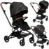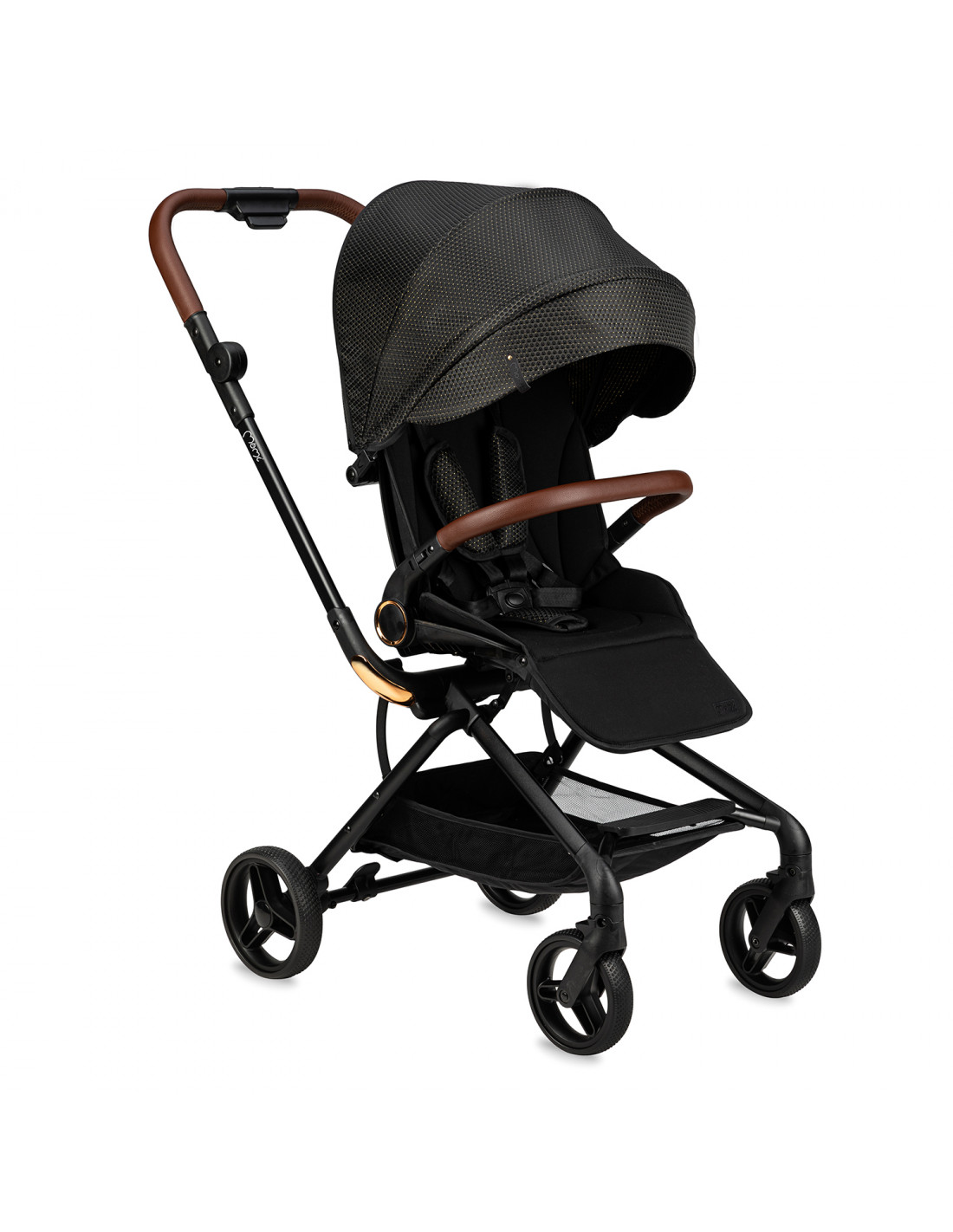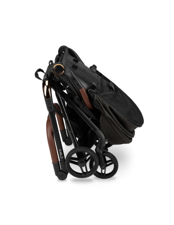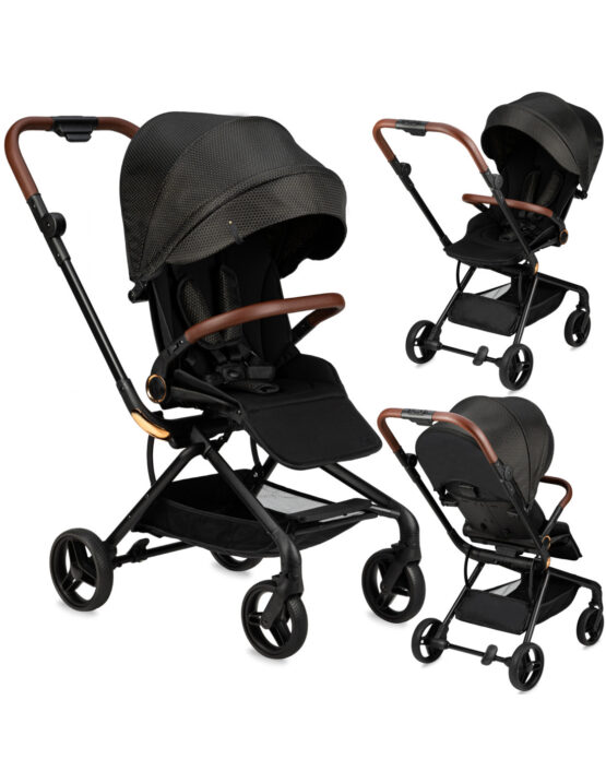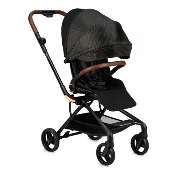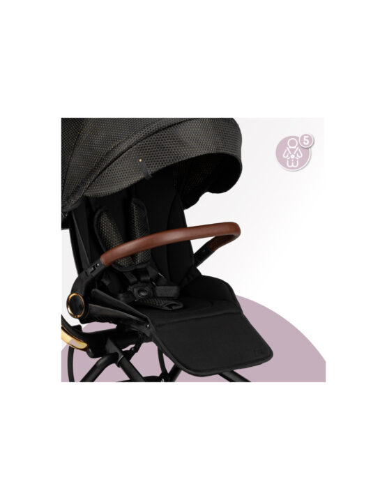 Черно-золотая версия коляски MoMi ADELLE представляет собой стильное сочетание коричневого и золотого цветов в классической коляске. Благодаря маневренным колесам и легкости коляска идеальна для путешествий.