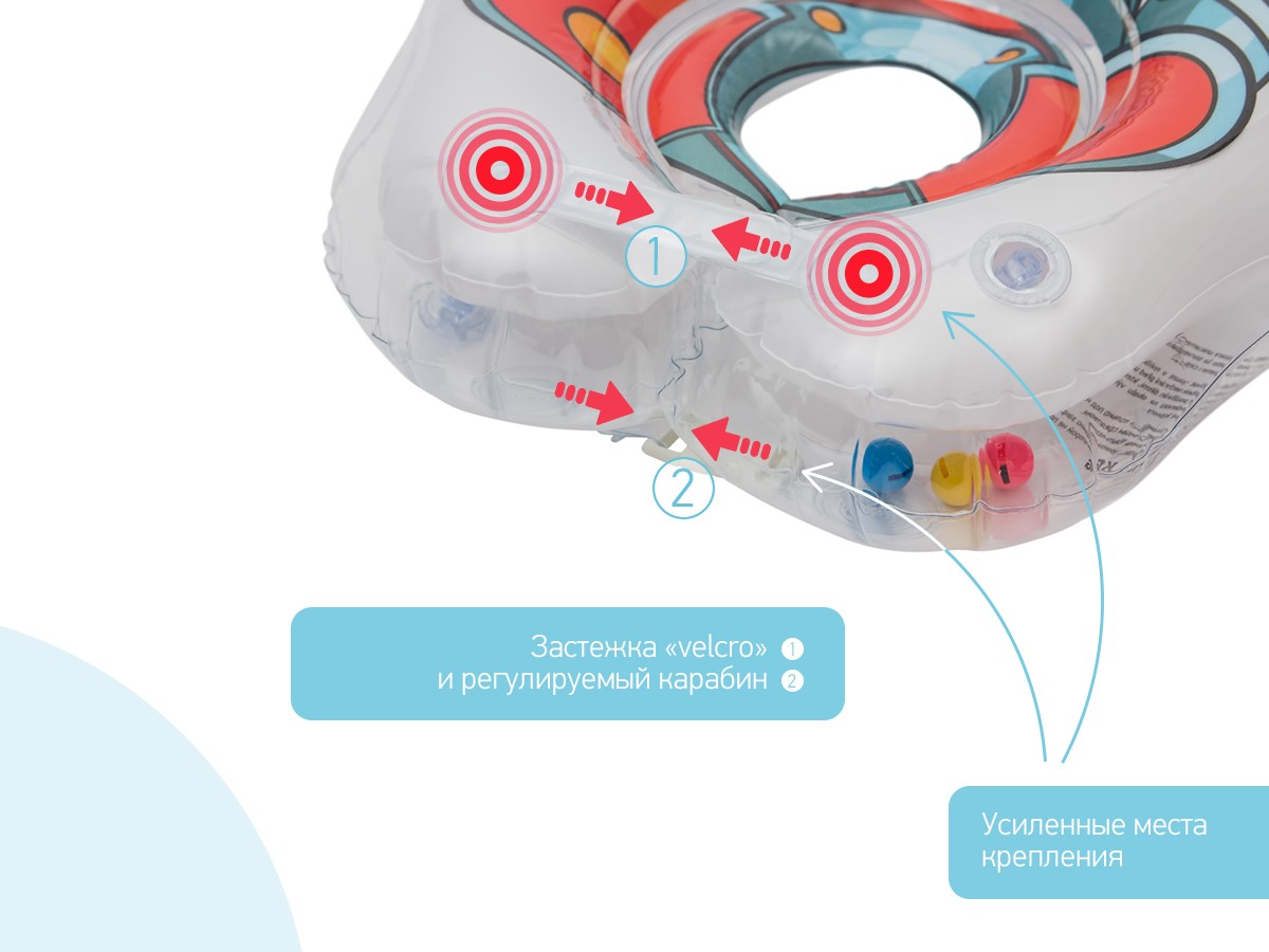 Надувной аксессуар для шеи малыша сделан из безопасного современного полимера, а также имеет две воздушные камеры, внутри которых есть шарики-погремушки для более увлекательного купания ребенка.