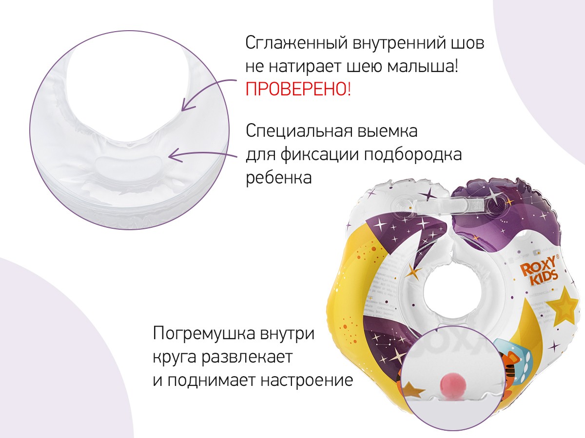 Ваш малыш будет свободно держаться на воде, шевелить ручками и ножками, при этом нос и рот будут защищены от попадания воды, а звенящая погремушка внутри развеселит вашего карапуза.