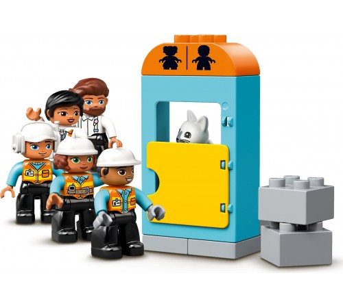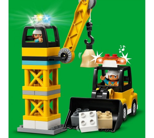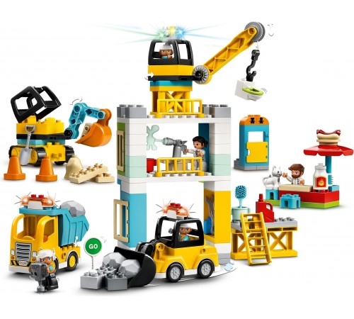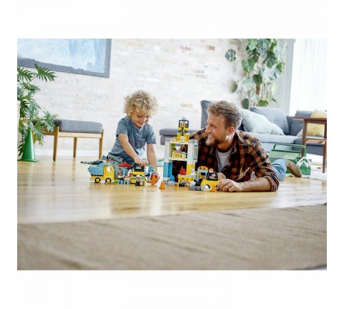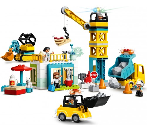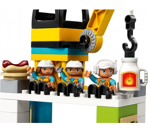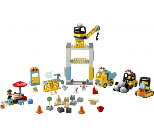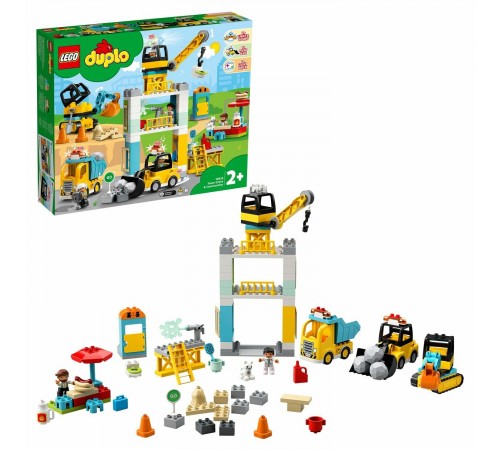 Ваш малыш сможет целый день играть с конструктором «Башенный кран на стройке» из серии LEGO DUPLO Town. Он представляет собой целую строительную площадку и состоит из множества различных деталей. Огромный башенный кран возглавляет весь процесс возведения новых зданий. Яркий грузовик с откидывающимся кузовом с легкостью увезет весь мусор и доставит новые строительные материалы. Экскаватор с подвижным ковшом и бульдозер на гусеничном ходу помогут маленькому строителю вырыть котлован, собрать мусор и огромные камни, чтобы они не мешали проезду транспорта. В перерывах персонажи игры могут сходить в туалет и полакомиться свежеприготовленным хот-догом.