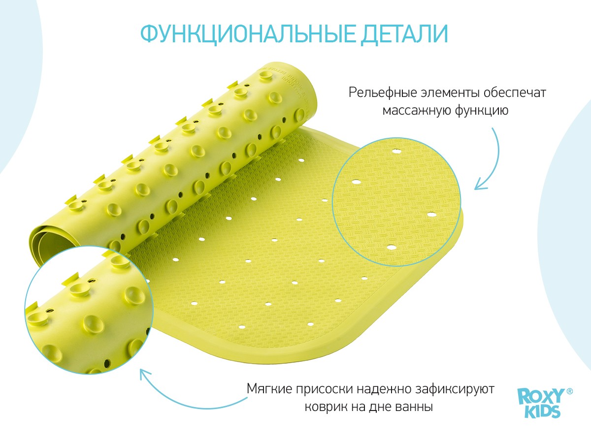 Поверхность коврика имеет рельефные элементы, обеспечивающие массажные функции, благодаря которым купание малыша станет не только простым и безопасным, но еще и полезным.
