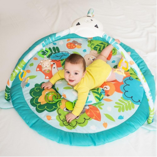 Развивающий коврик Friendly Forest гарантирует каждому малышу часы фантастического времяпровождения. Коврик оснащён двухсторонним проектором с 8 мелодиями; благодаря музыке и визуализации способствует развитию чувств. Проектор сверху показывает звёзды на потолке, а снизу находятся цветные лампочки. Наш коврик отличается насыщенными контрастными цветами, которые развивают чувство зрения, воображение и концентрацию внимания. Коврик растёт вместе с ребёнком; сначала на нём можно лежать на спине, позже также на животе, а когда ребёнок начинает сидеть и ползать, коврик становится местом для игр. К коврику прилагается подушка Tummy Time, позволяющая ребёнку удобно лежать на животе.