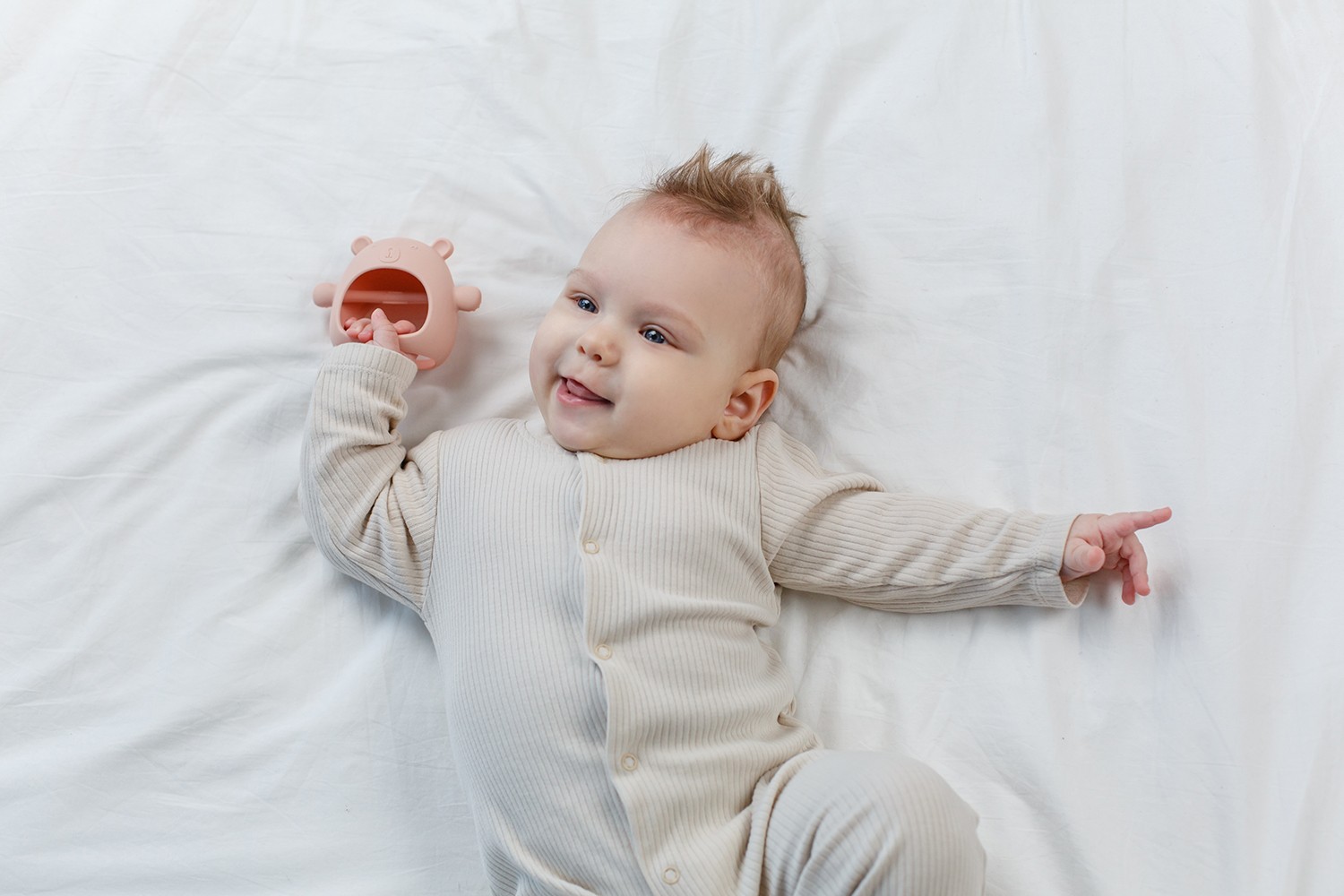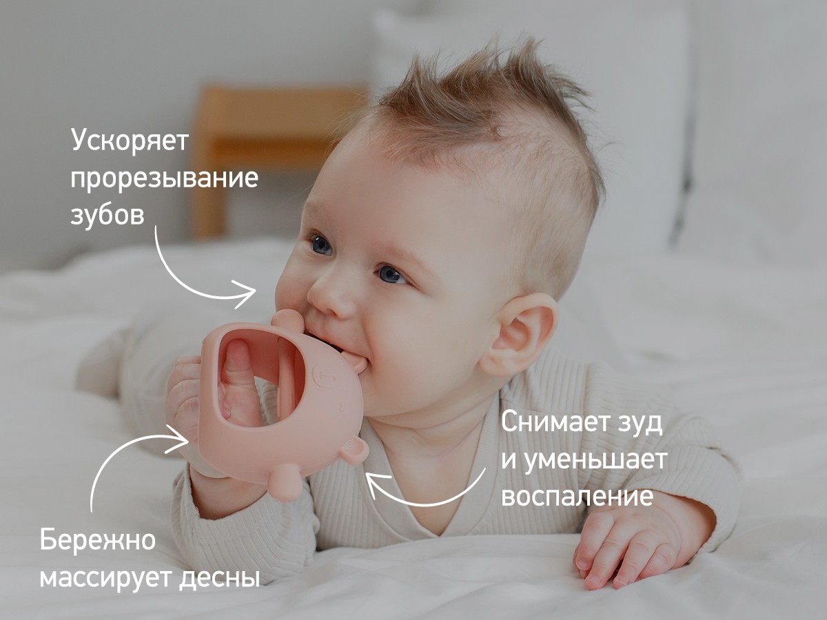 Использование прорезывателя успокаивает малыша, развивает координацию и моторику рук.