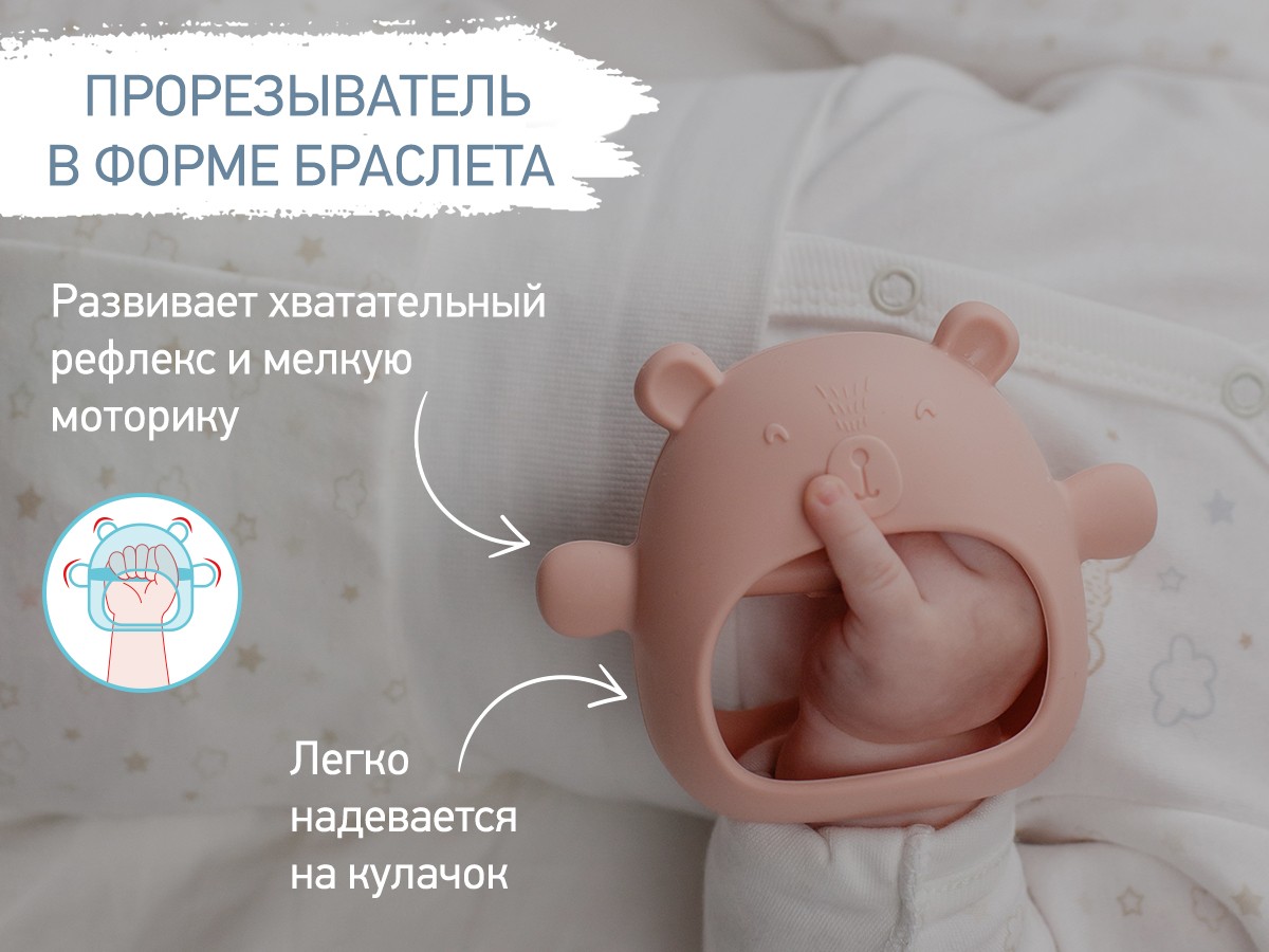 Прорезыватель-браслет надевается на руку малышу, а внутри ребенок крепко держит в кулачке держатель-перемычку благодаря хватательному рефлексу, поэтому прорезыватель не падает и не теряется.
