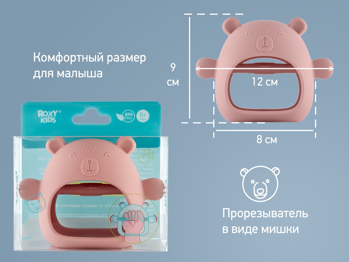 Силиконовый прорезыватель BEAR от ROXY-KIDS безопасно массирует десны рельефными элементами в виде ушек и лапок мишки и снимает неприятные ощущения во время прорезывания зубов.