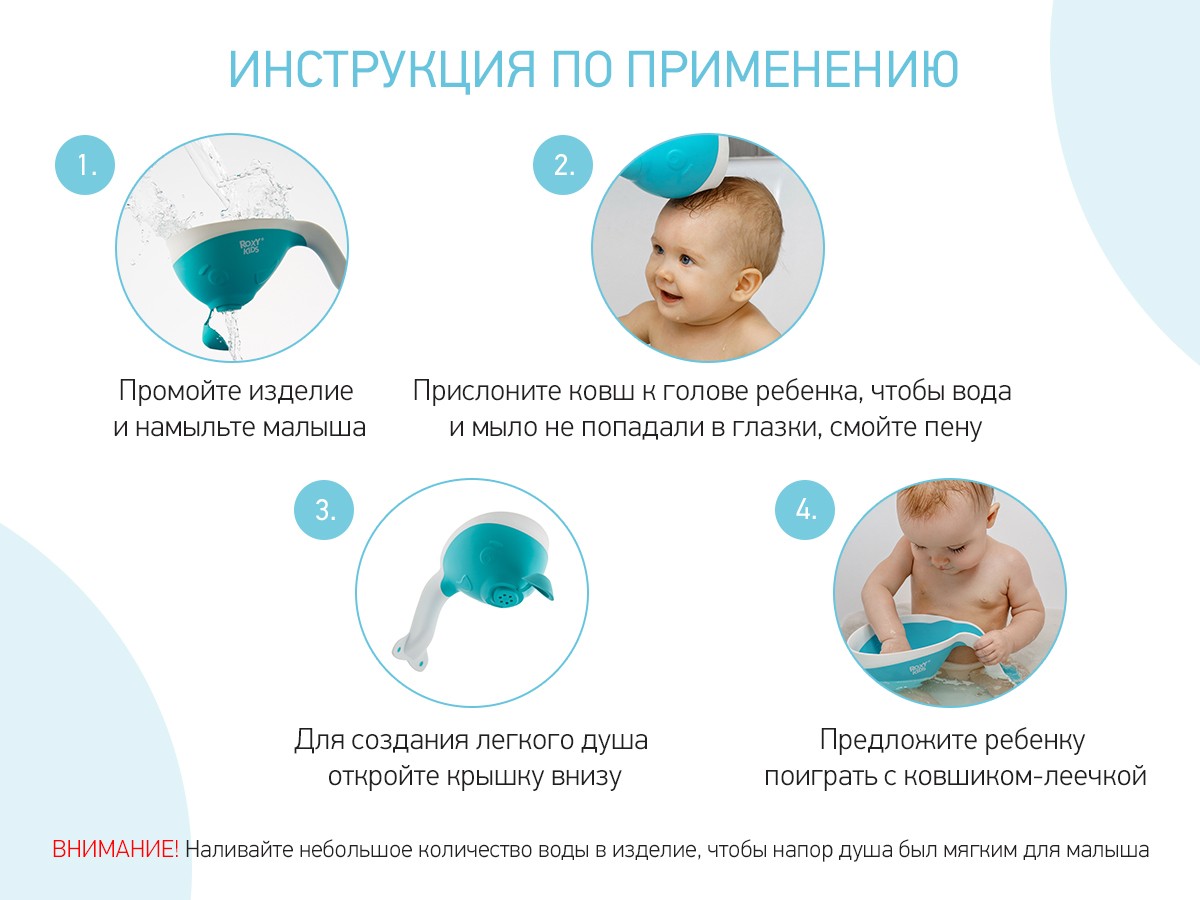 Съемный носик превращает ковшик в лейку, благодаря чему вы сможете развеселить малыша, показывая струйки воды приучая его к душу.