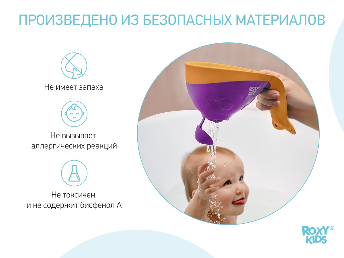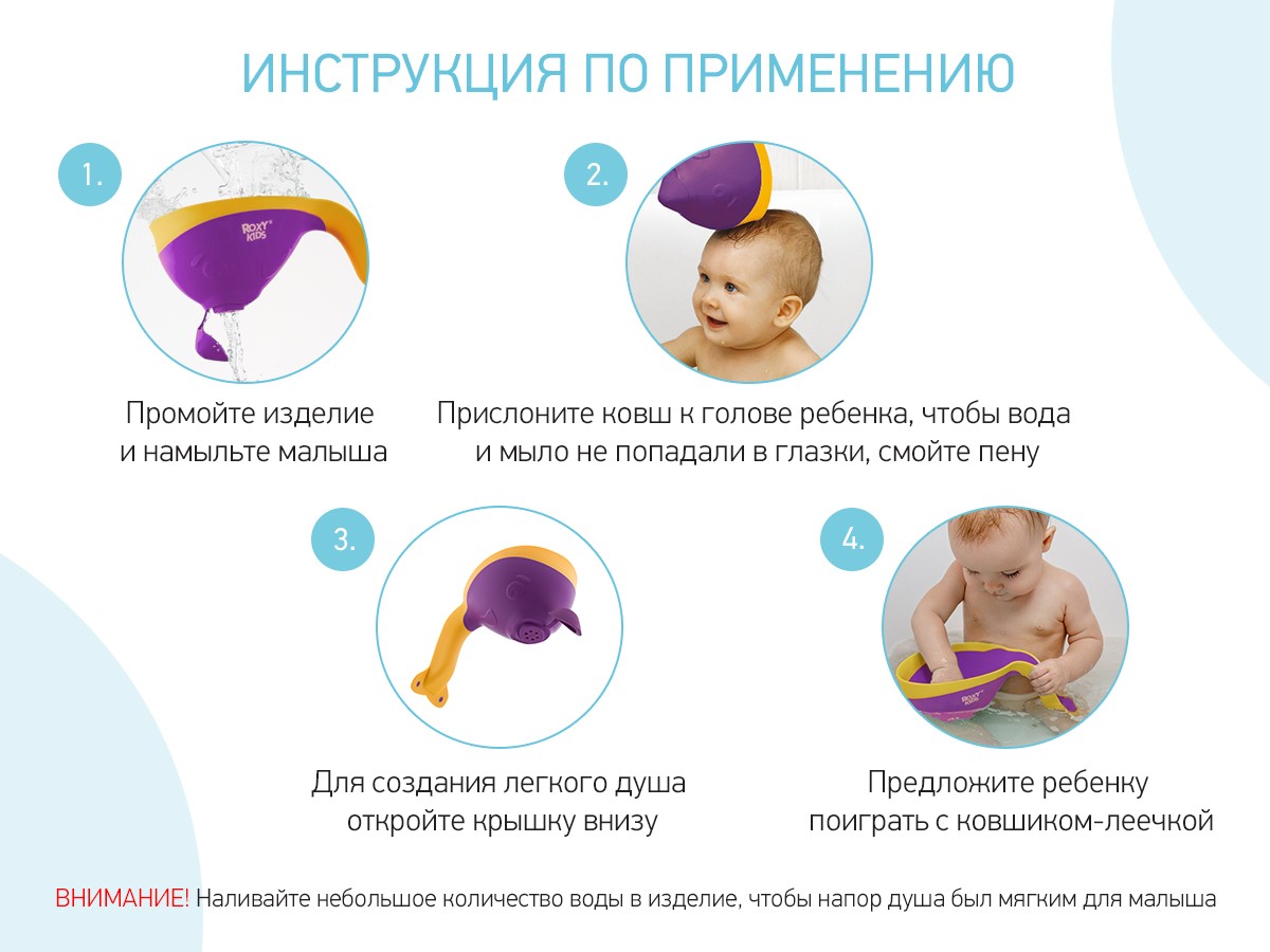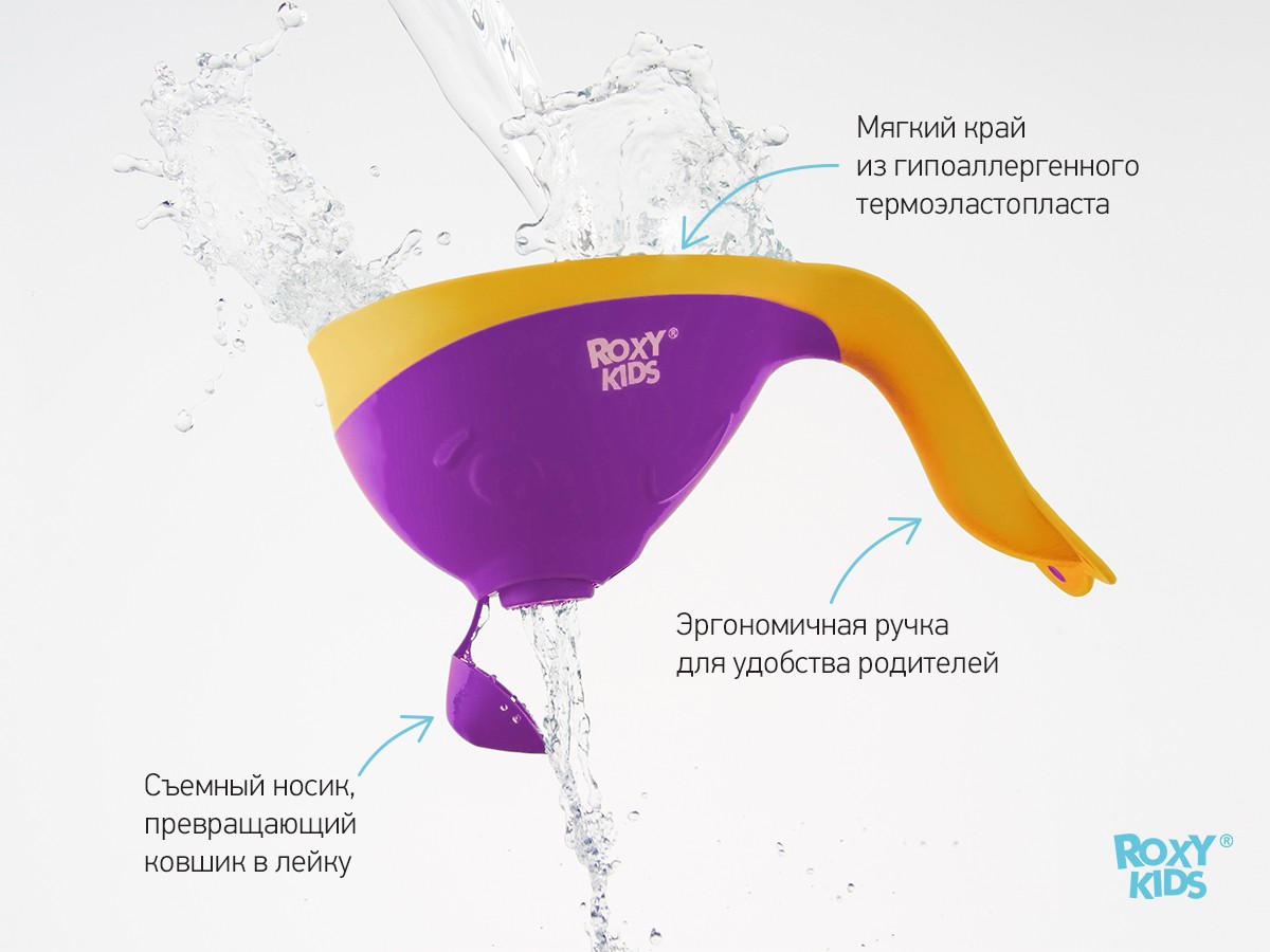 Съемный носик превращает ковшик в лейку, благодаря чему вы сможете развеселить малыша, показывая струйки воды приучая его к душу.