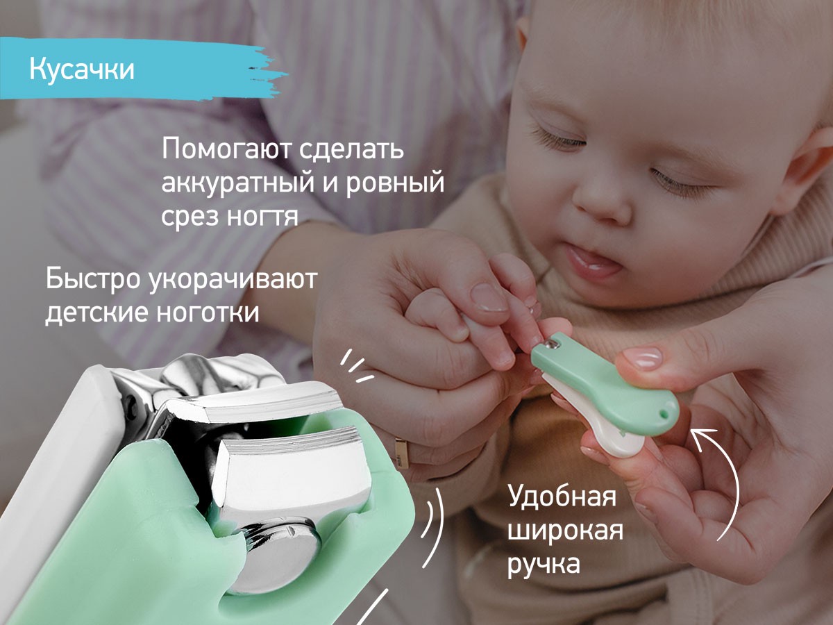 Закругленные ножницы идеально подходят для мягких и маленьких ногтей малышей, мелкозернистая пилочка устранит неровности ногтя после стрижки, кусачки помогут выполнить аккуратный и ровный срез ногтя.