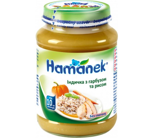 Индейка – является диетическим мясом, не вызывает аллергической реакции. Его особенность — это большое содержание микроэлементов и витамин. В этом виде мяса содержится калий, железо, кальций, витамины группы В и А. Высокое содержание витаминов РР, необходимые для развития головного мозга и нервной системы малыша. Тыква содержит важный для зрения витамин В, а вместе с витамином Е он улучшает состояние кожи. Аскорбиновая кислота, которая содержится в тыкве, увеличивает защитные функции организма. Так же содержит клетчатку, которая благоприятно влияет на все процессы пищеварительной системы. Пюре Hamanek Индейка с тыквой и рисом прекрасный сбалансированный обед для малыша!