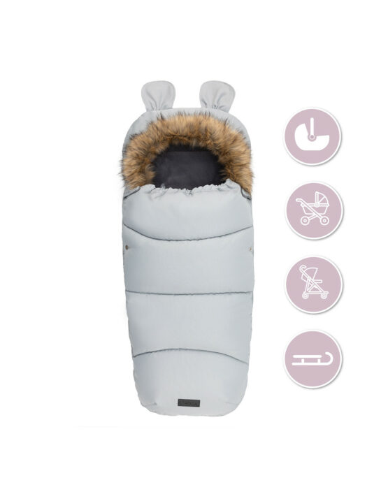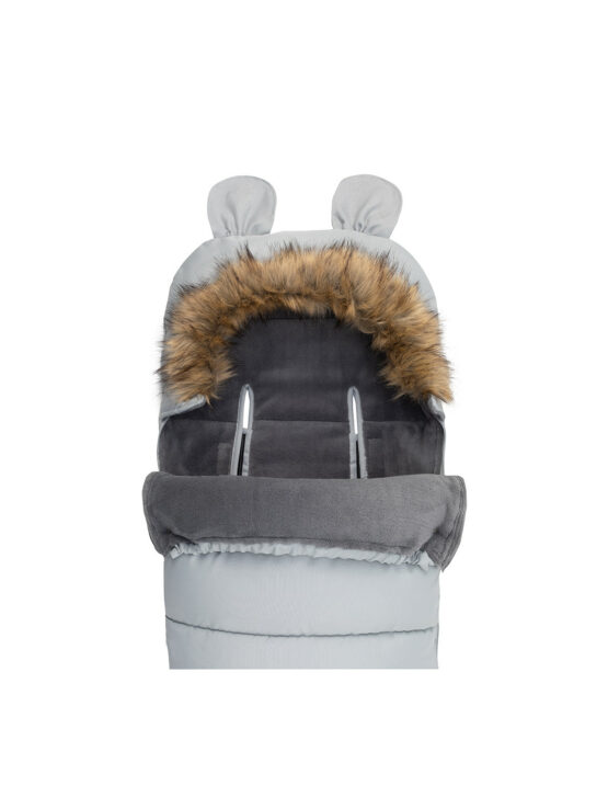 Муфта MoMi имеет теплый капюшон с забавными ушками, отороченными съемным искусственным мехом. Прорези для ремней подходят для 3-х и 5-точечных ремней.